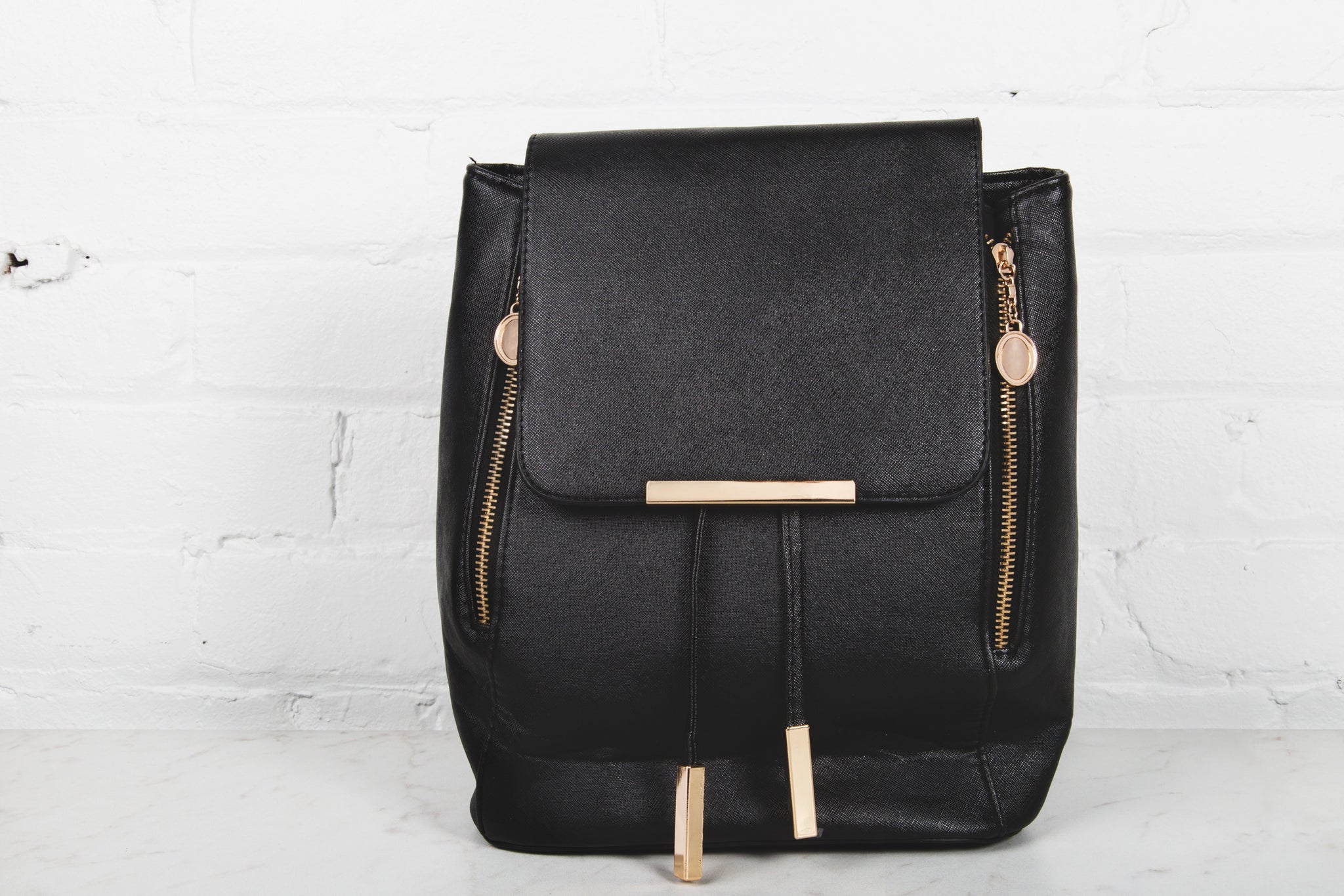 this is a black backpack with gold zippers.